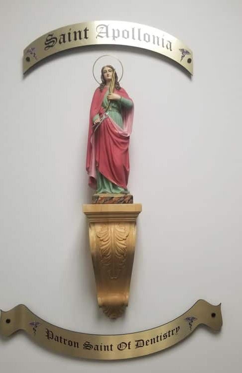 O Glorious Apollonia, patron saint of dentistry and refuge to all those suffering from diseases of the teeth, I consecrate myself to thee, beseeching thee to number me among thy clients. Assist me by your intercession with God in my daily work and intercede with Him to obtain for me a happy death. Pray that my heart like thine may be inflamed with the love of Jesus and Mary, through Christ our Lord. Amen. O My God, bring me safe through temptation and strengthen me as thou didst our own patron Apollonia, through Christ our Lord. Amen.